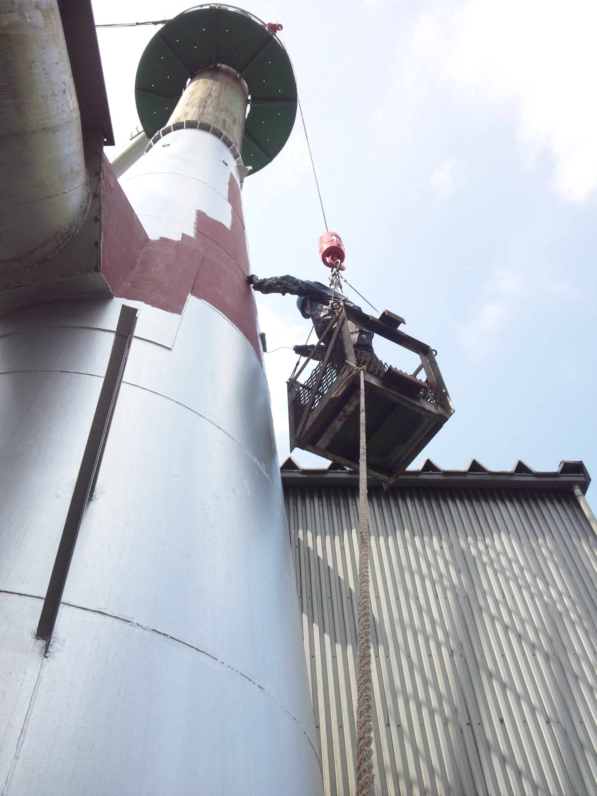 山の中のプラント3 上塗りもゴンドラにて塗装中です。 下から見ているとかなり怖そうですが、塗ってる本人は意外と快適な空間。 自動で移動しますから仮設足場よりも楽です。 ただ風には弱いで注意が必要です。(ロープで下から引っ張っています) 300℃耐熱塗料の塗装作業。 無事塗装完了です。 ツイート « 山の中のプラントⅡ 山の中のプラントⅣ »