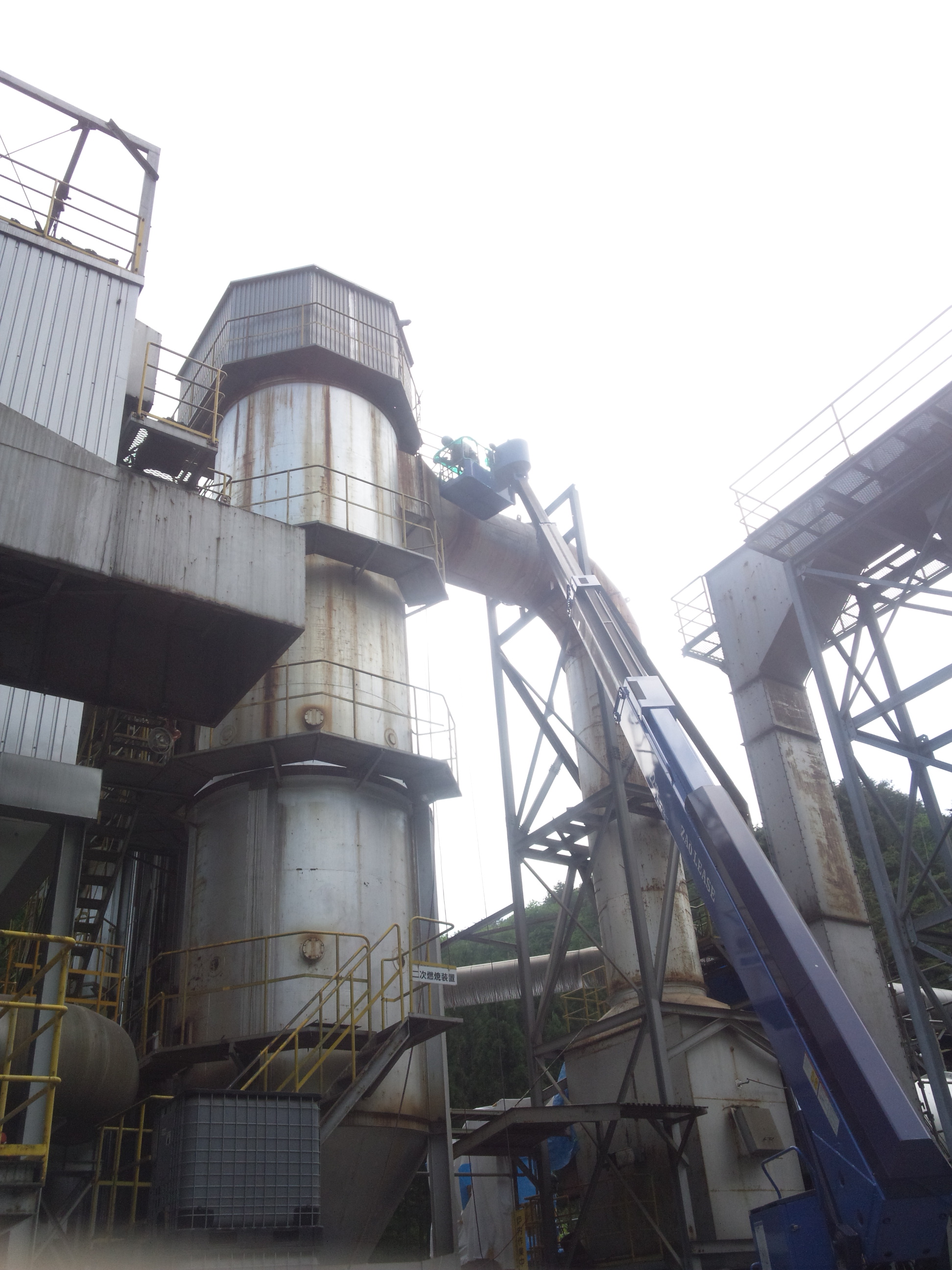 山の中のプラントⅣ untitled ダフトと呼ばれる中央の構造物を塗装します。 今回も仮設足場はありません。「下の通路を確保せよ」との指示ですので中々その辺りが大変です。 untitled 写真見ずらいですが、高所作業車にて施工中。 この高さは20mほど結構高さあります。 つづく ツイート « 山の中のプラント3 山の中のプラントⅤ »
