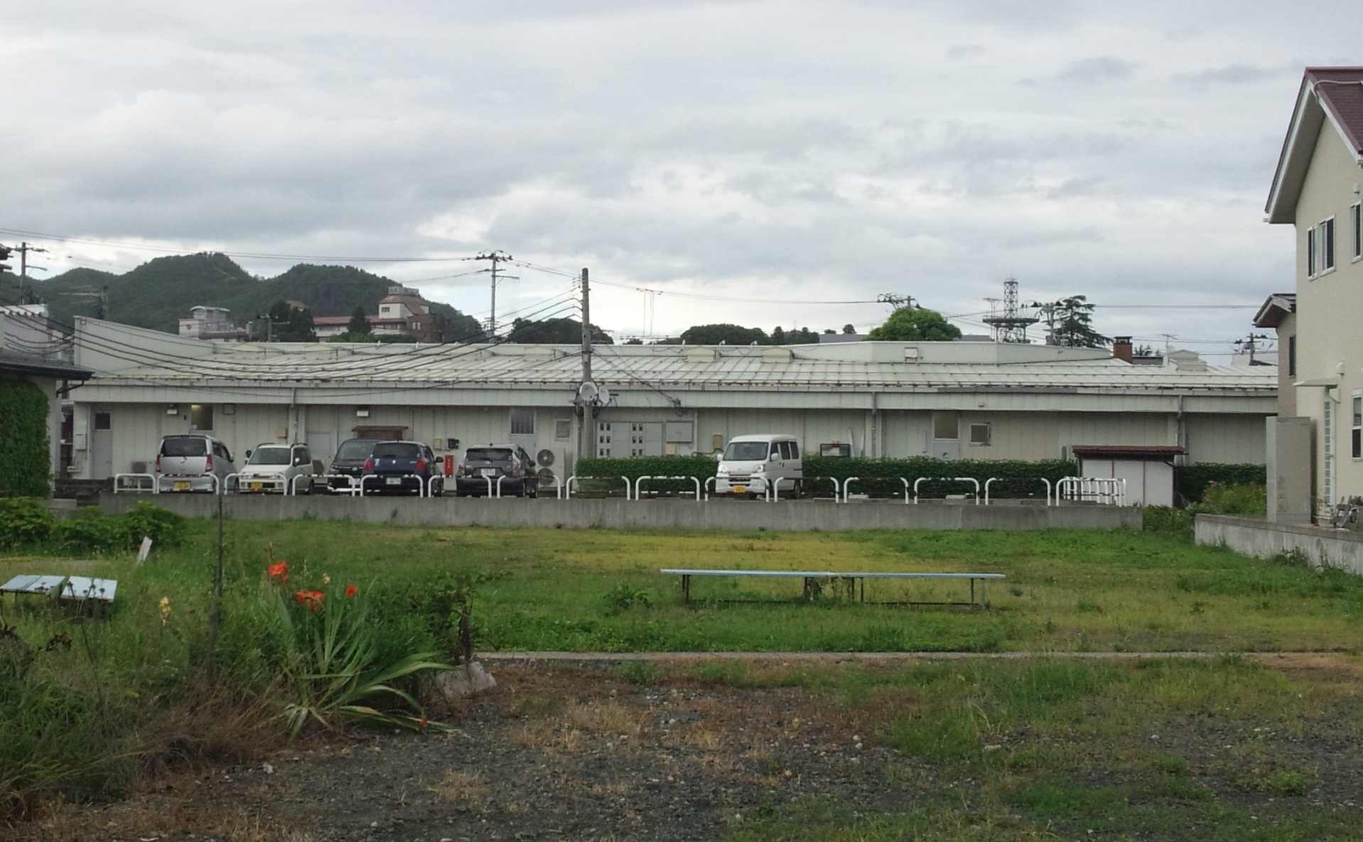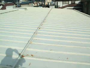 竪長尺屋根で色はアイボリー。面積1100㎡。