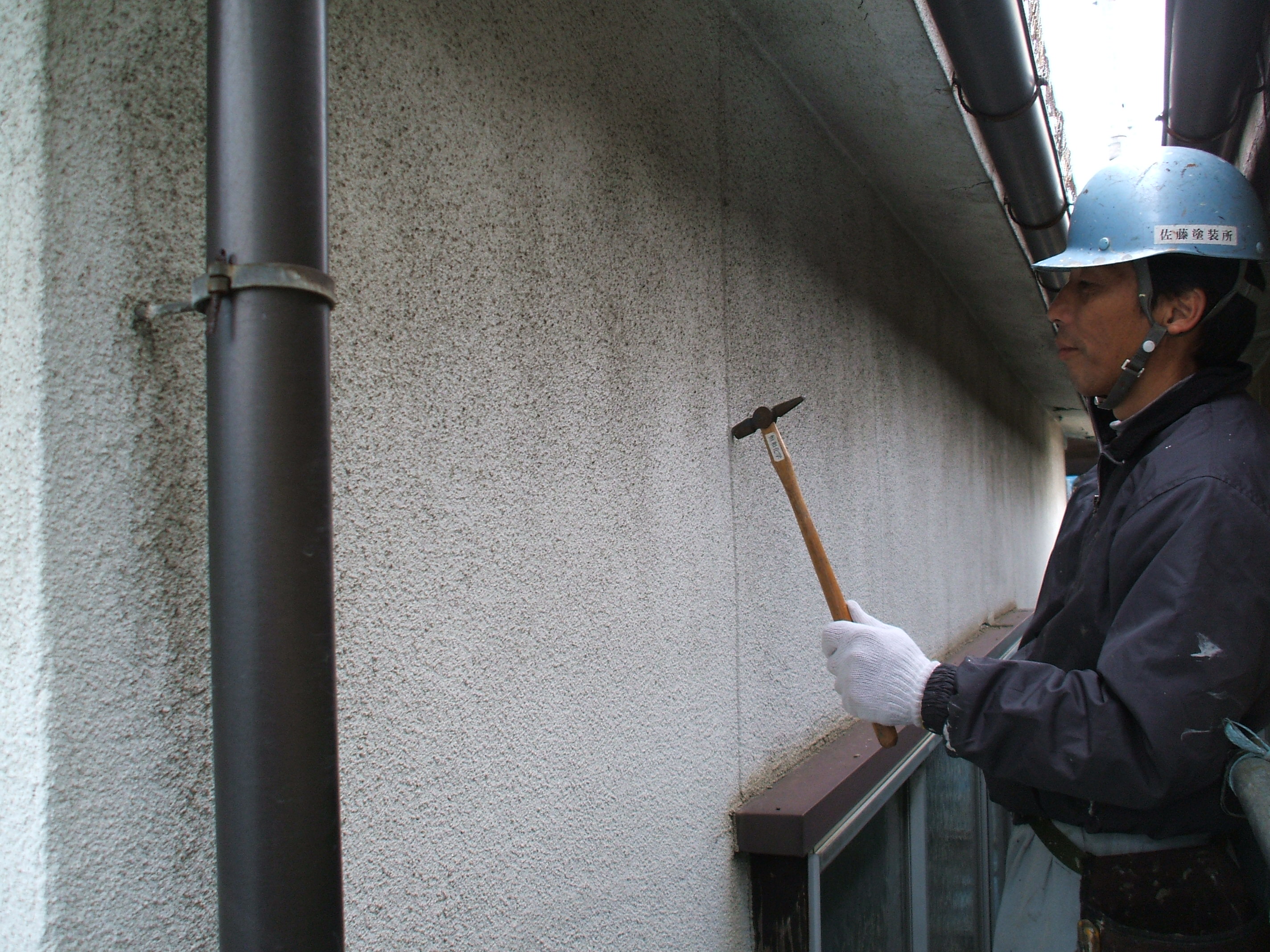 バスやトラックのプロの運転者がタイヤホイールを点検するような外壁専用のトンカチで音を頼りにチェックしていきます。