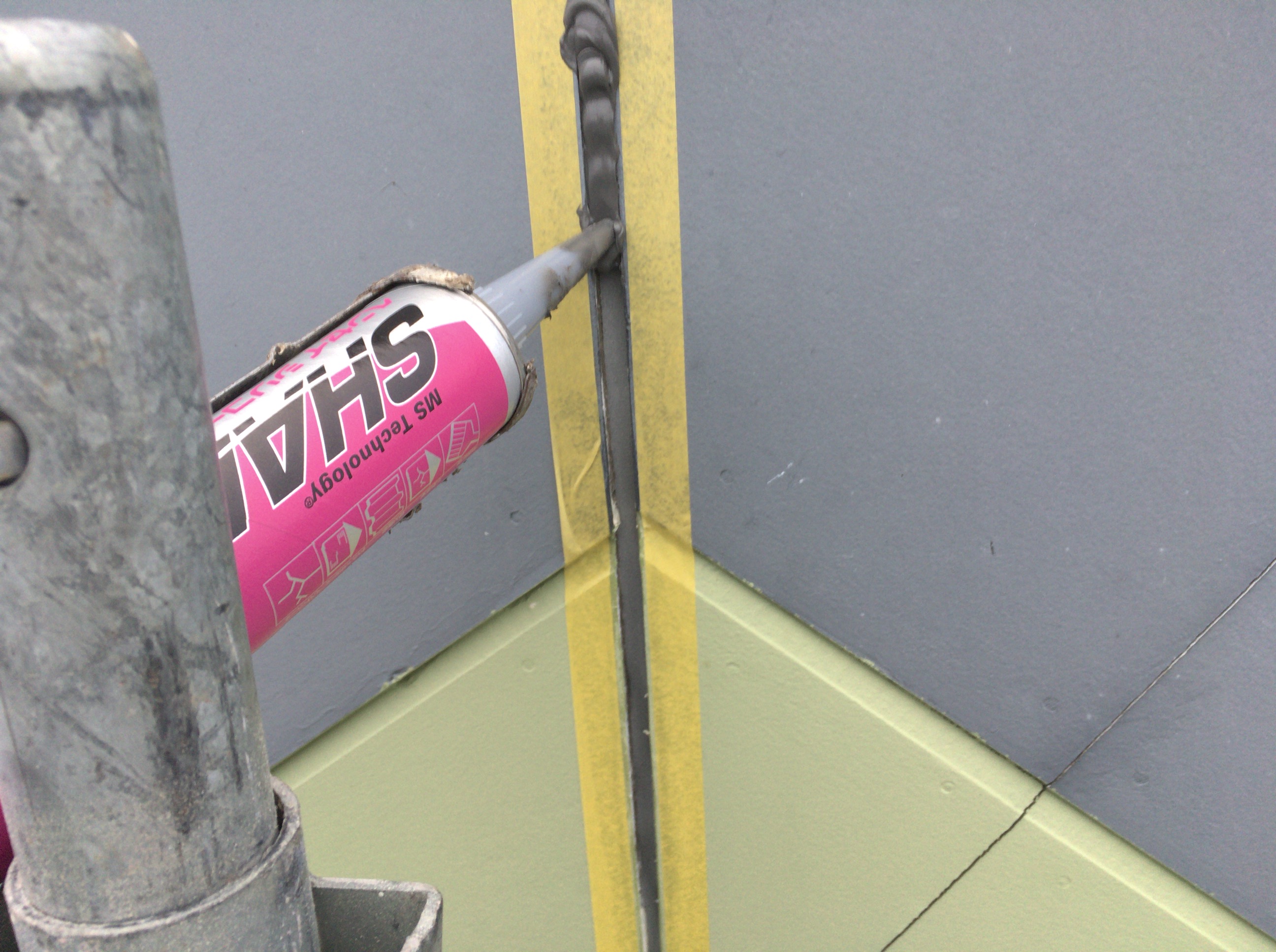 マスキングテープはり、専用プライマーを塗り、シーリング充填中。