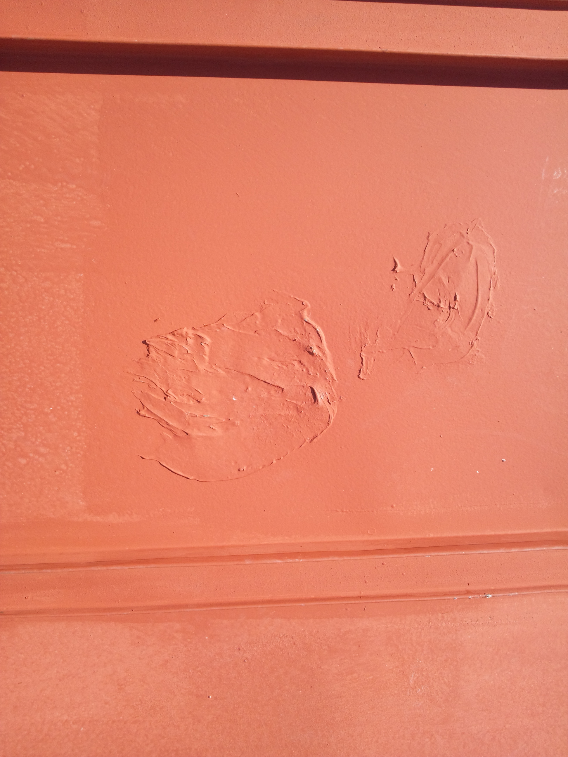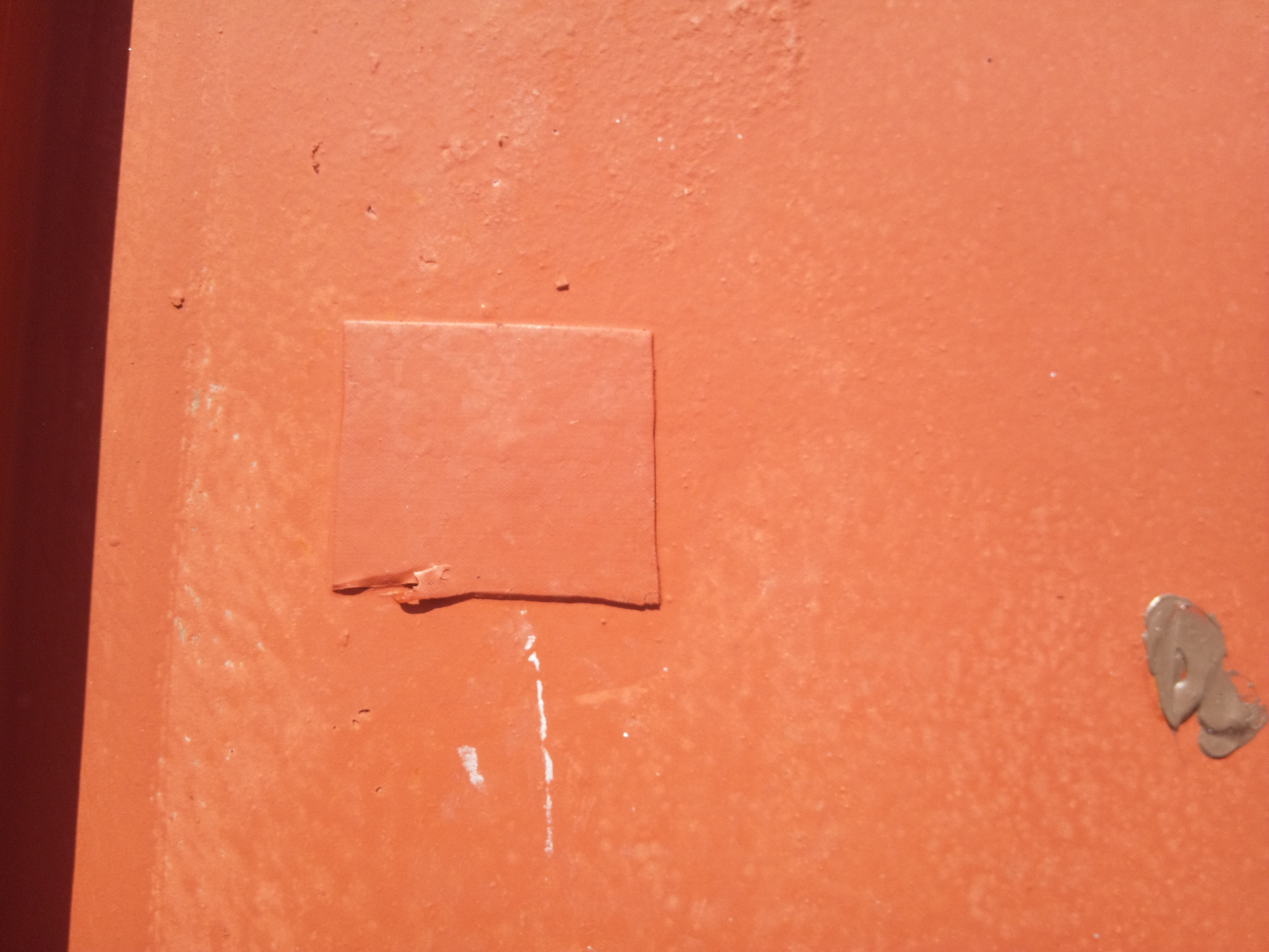下の写真は塗装前に穴が開いていたので、防水テープを張り錆び止めを塗装した状態です。