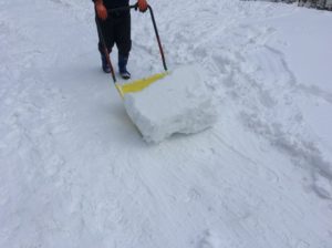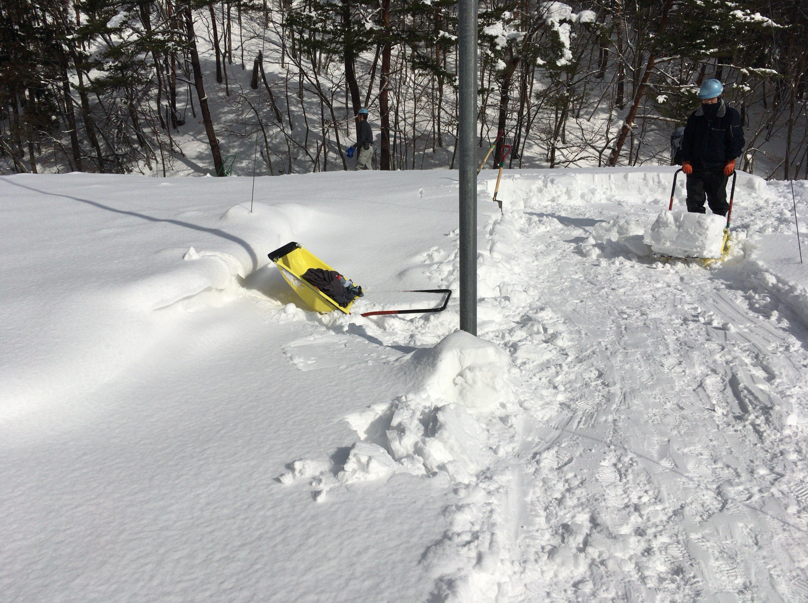 毎朝冷え込み、スコップが歯が立たず、チェンソーを持ち込み切れ混みを入れ、それをスノーダンプでピストン輸送。