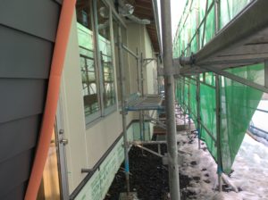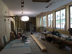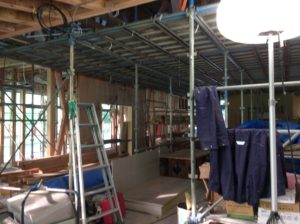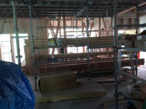 中央部の天井が高く、吹き抜け状になっているため足場が組まれております。