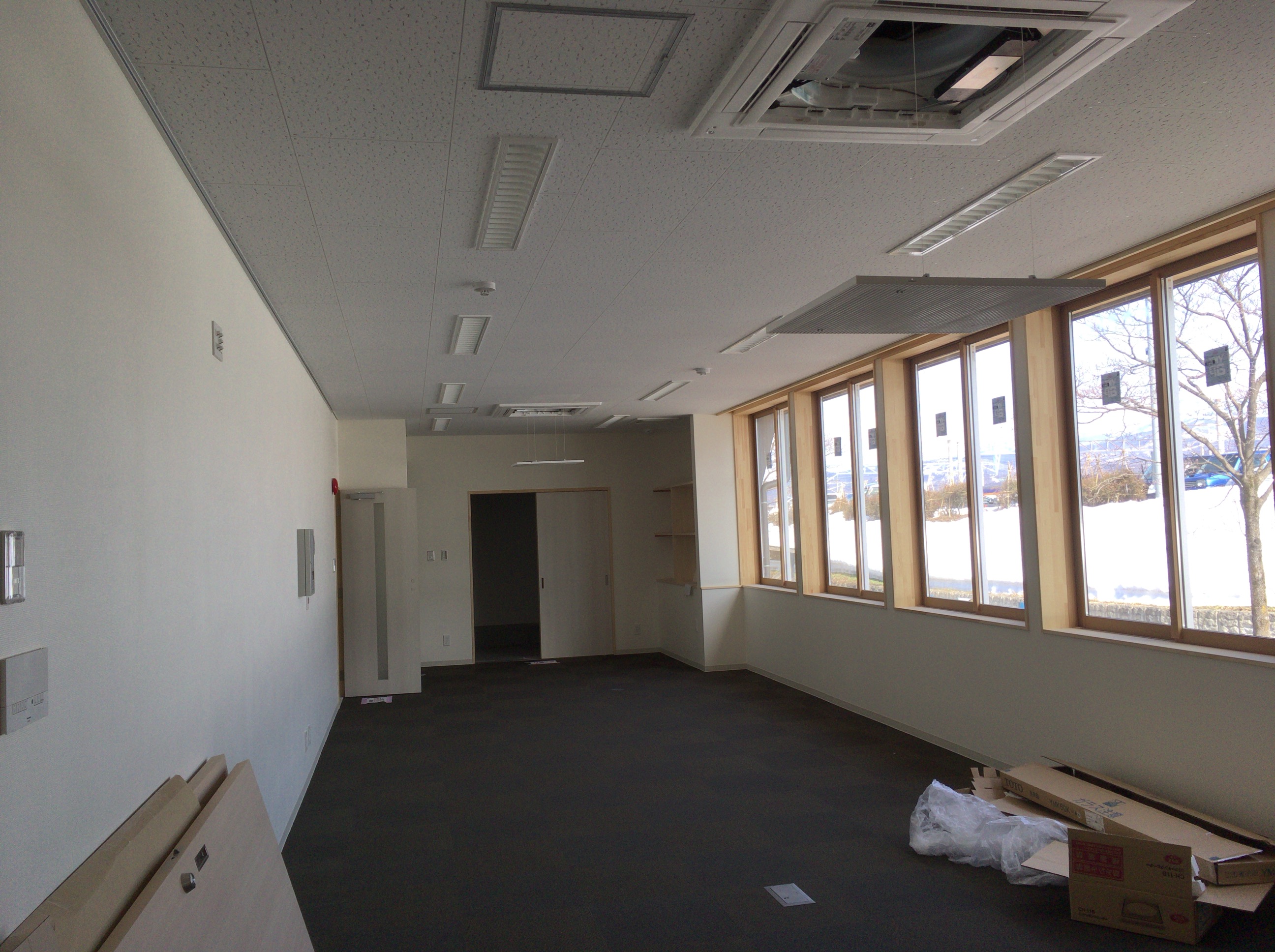 事務所はカーペットが敷かれ、照明器具が付きエアコンの工事中です。