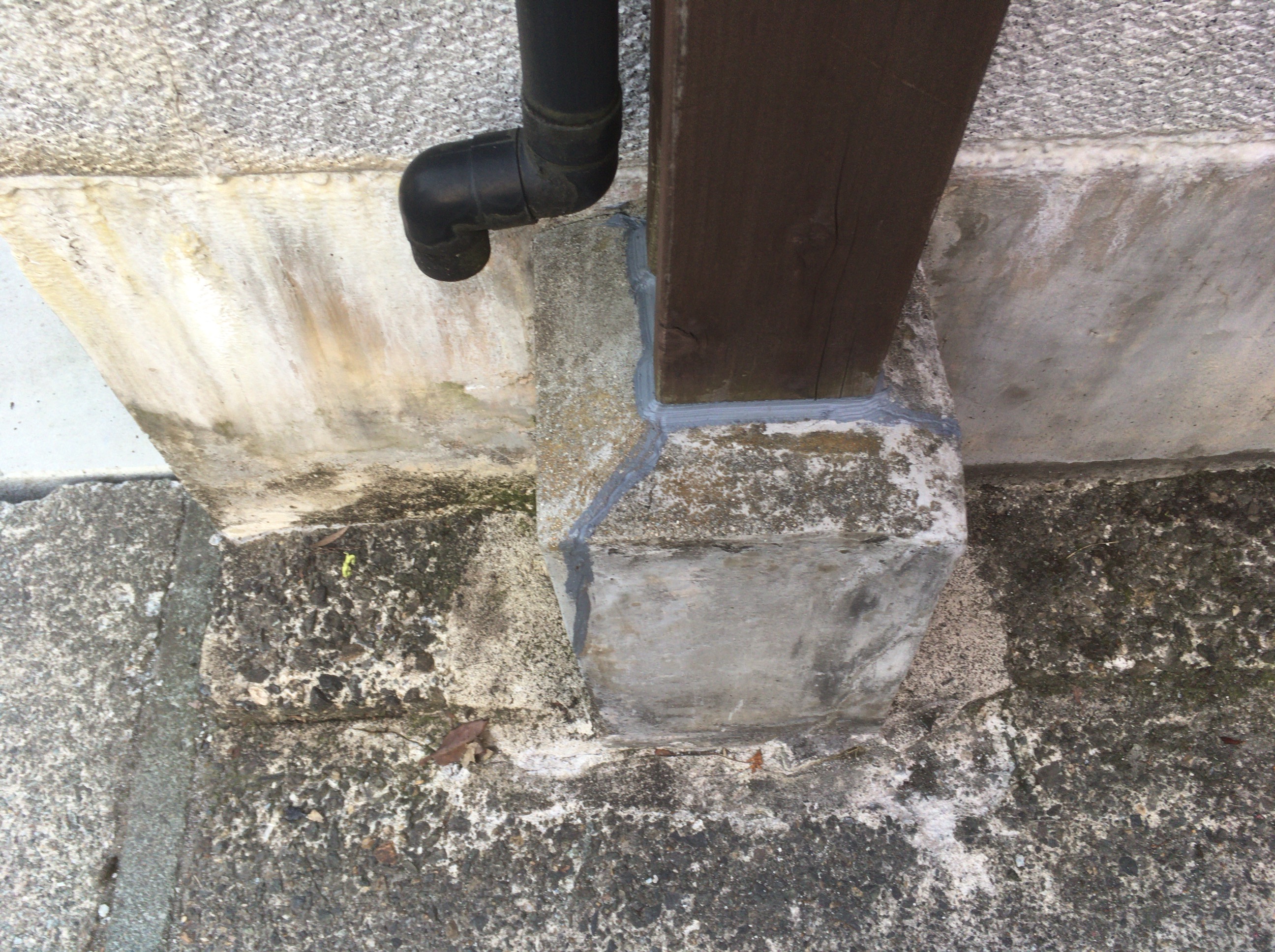 コンクリートの基礎との隙間から水が浸入していましたので、グレーのシーリングで埋めていきます。