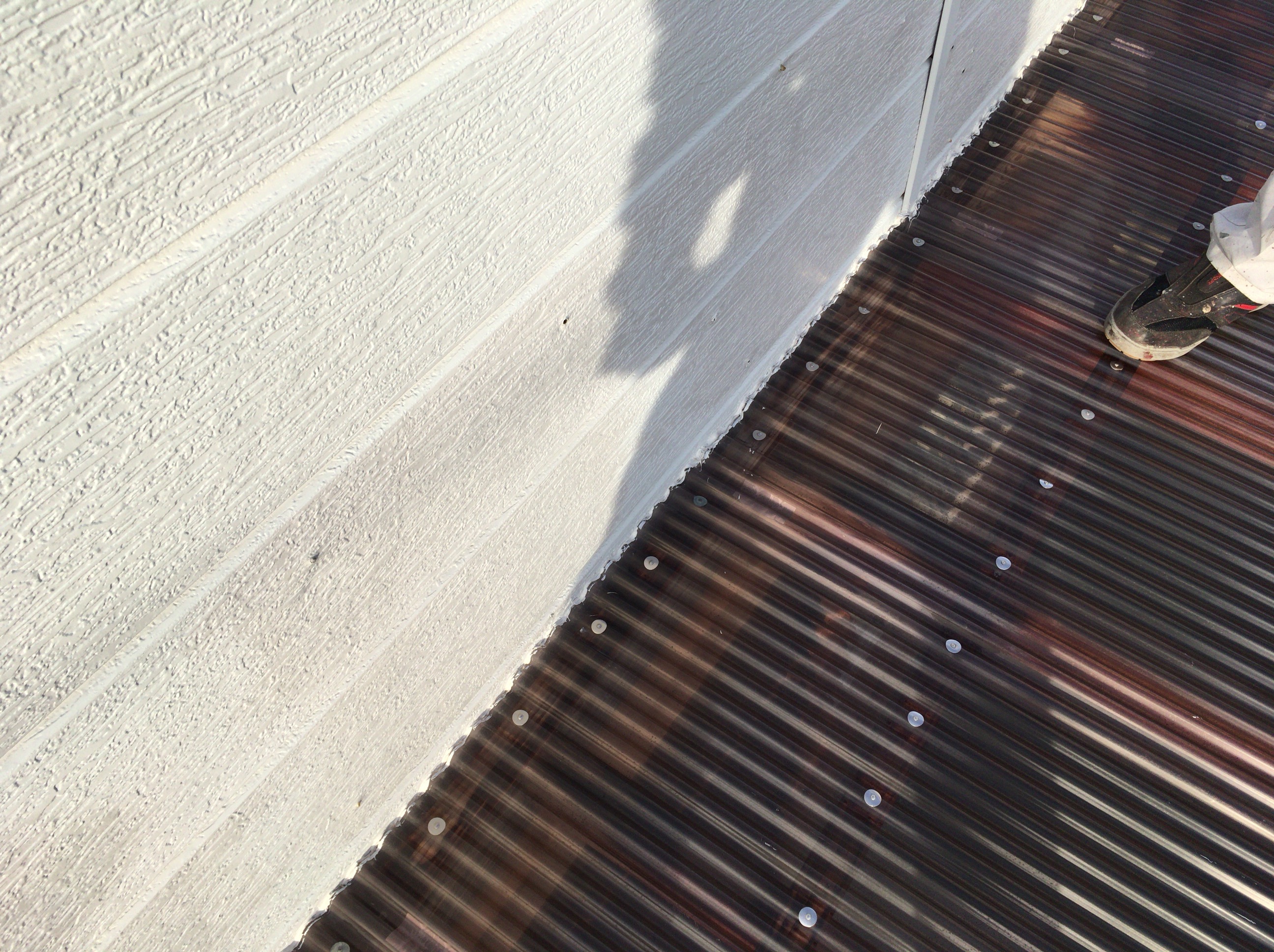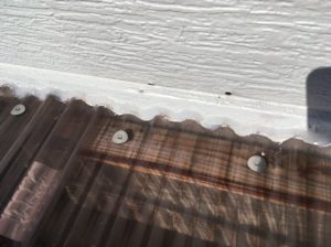 わかりづらいですが白い部分が外壁(アイジーサイディング)でポリカネートで下屋を出したところなんですが、その境目から雨水が落ちてくるとのこと。